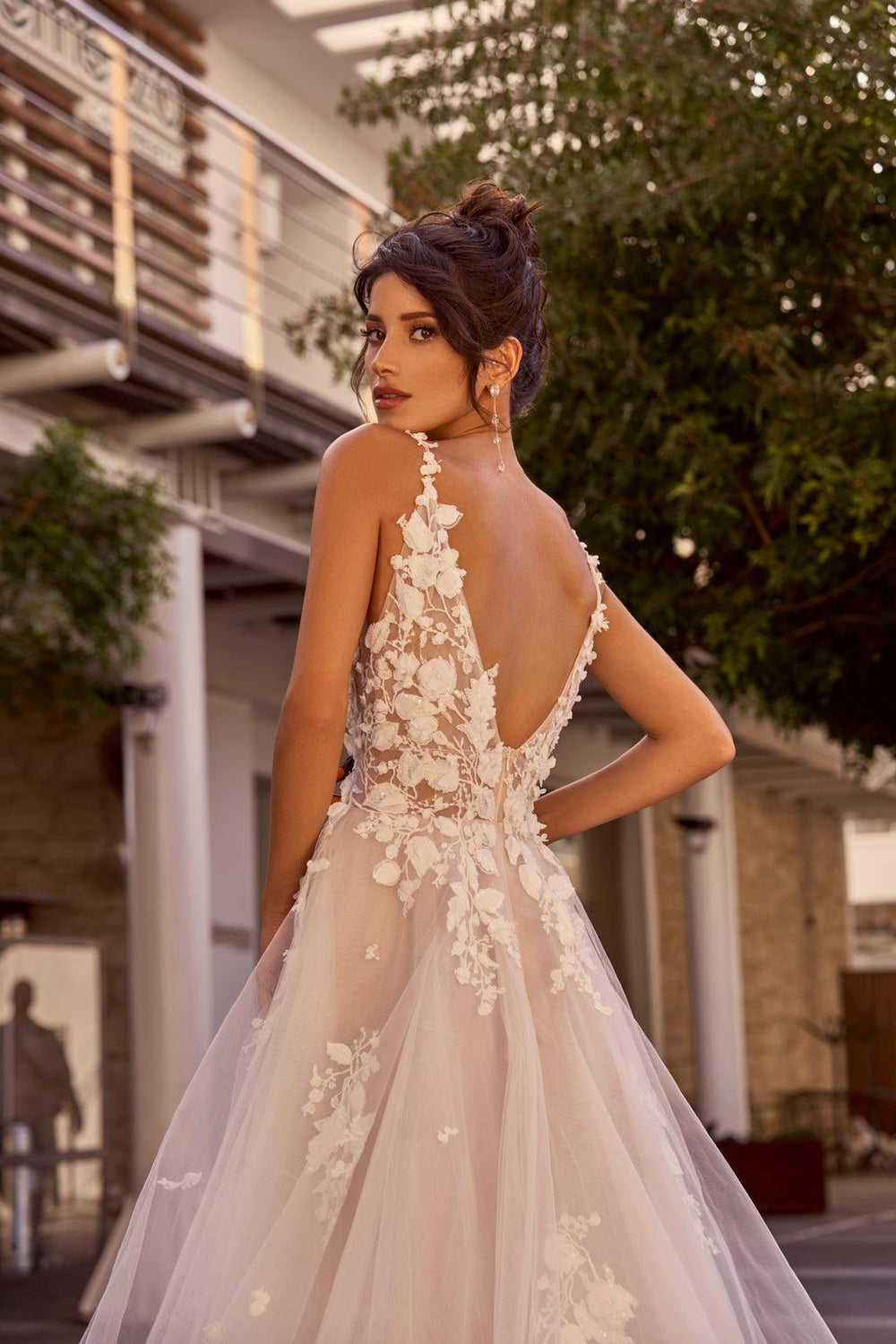Ein elegantes A-Linien-Kleid in Nude ist aus weichem Netzstoff gefertigt. Es hat einen zarten V-Ausschnitt. Das Oberteil mit dünnen Trägern ist vollständig mit dreidimensionaler Spitze und handgearbeiteten Blumen verziert. Sie sind mit Perlen bestickt. Auf der Rückseite des Kleides befindet sich ein tiefer Ausschnitt. Der Netzrock ist ebenfalls mit Spitzeneinsätzen bestickt und geht in eine lange Schleppe über.