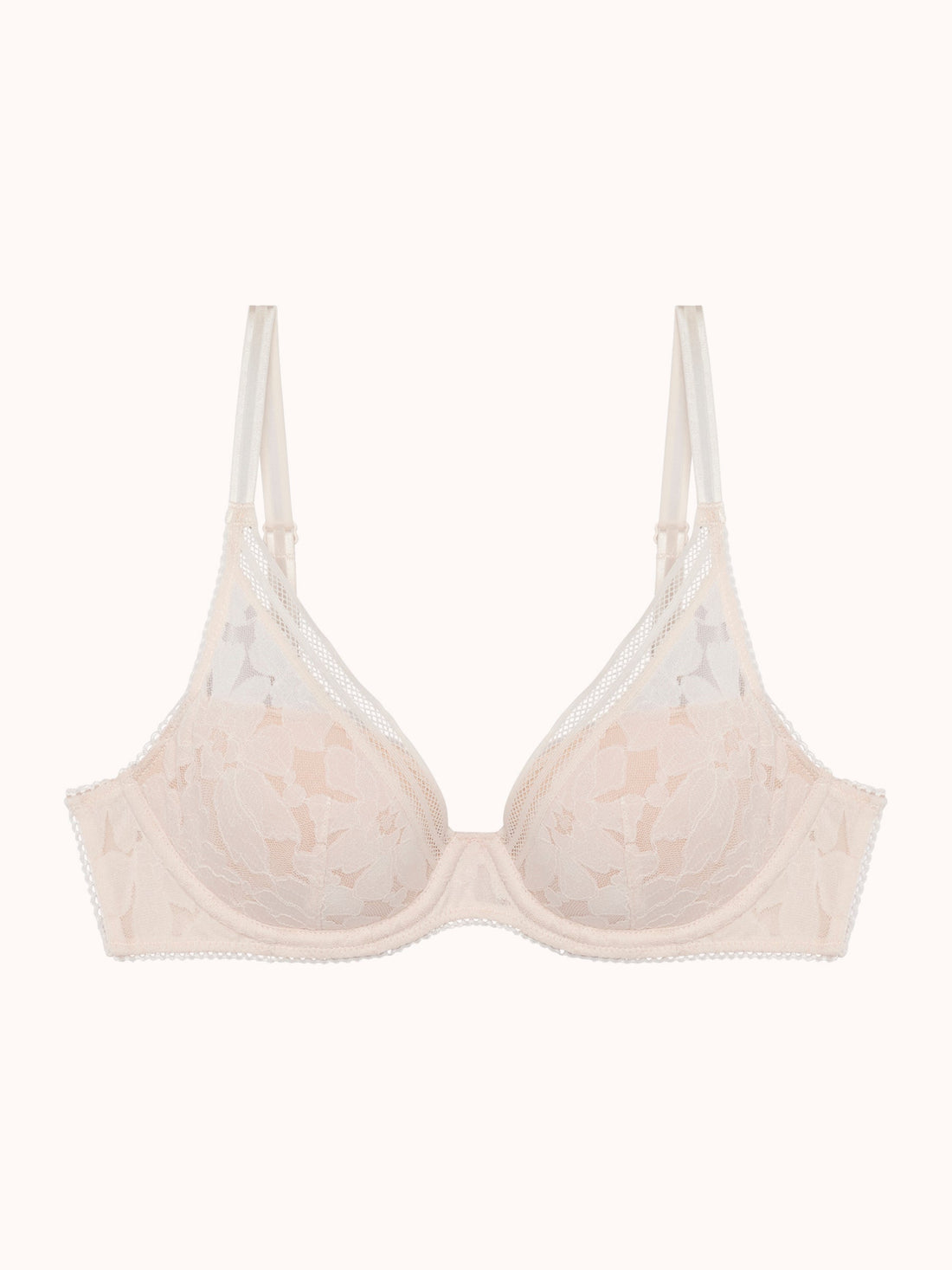 Ein gepolsterter BH mit tiefem Dekolleté. Die Highlights: Ein Triangel-BH mit leichter Polsterung für zusätzlichen Halt. Rückenteil aus Mikrofaser für Komfort und glättenden Effekt. Eine auffällige, weiche, elastische Blumenspitze – ethisch hergestellt – kombiniert mit einem grafischen Elastikband, das die Kurven des Körpers betont.