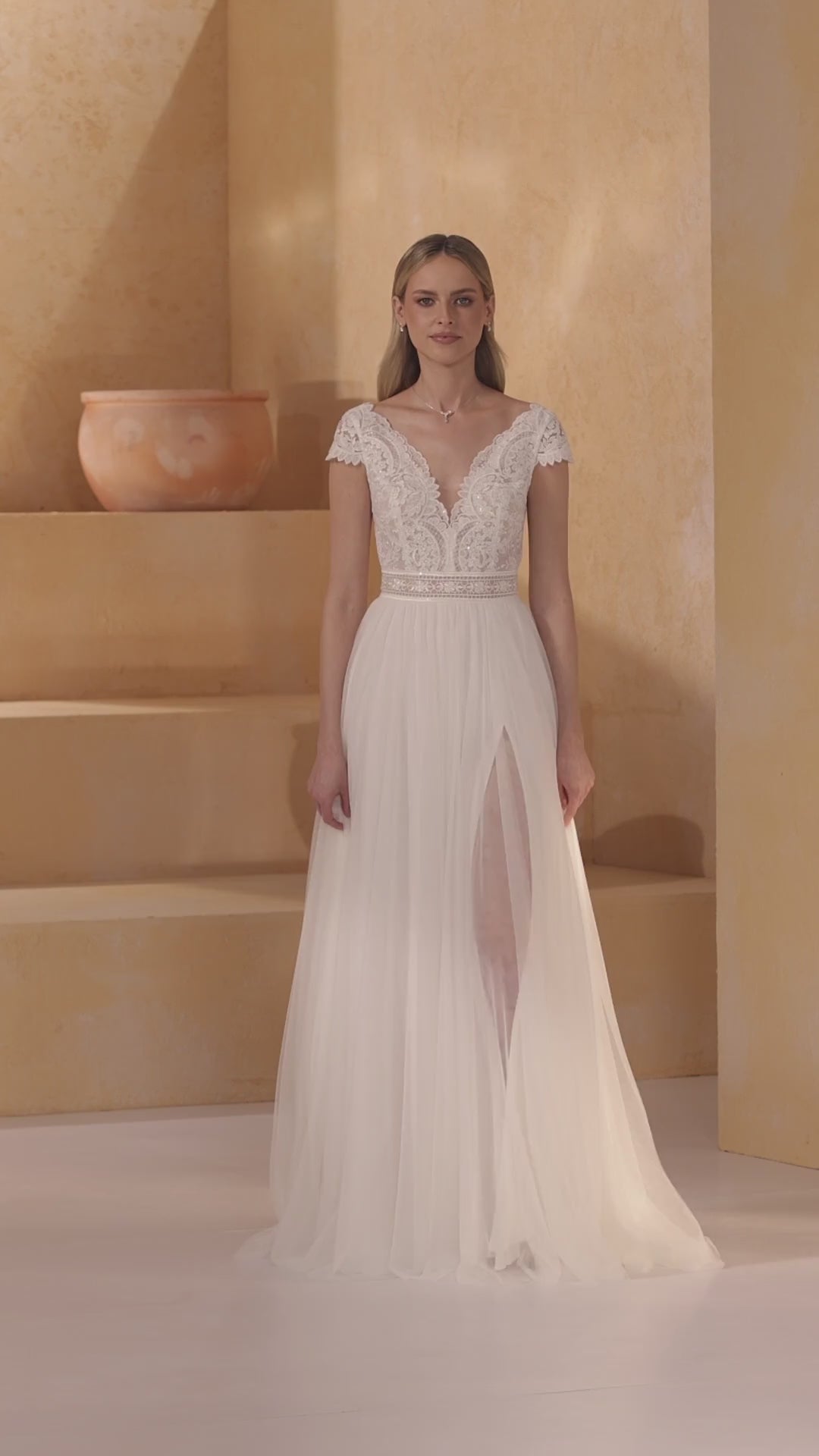 Das MOLI-Brautkleid in A-Linie ist mit atemberaubendem Spitzen- und Tüllstoff gestaltet. Das elegante Brautkleid hat sowohl auf der Vorder- als auch auf der Rückseite einen V-Ausschnitt und kommt mit stilvollen kurzen Ärmeln. Alle Brautkleider von Bianco Evento werden sorgfältig innerhalb der EU entworfen und in unseren hauseigenen Produktionsstätten hergestellt.