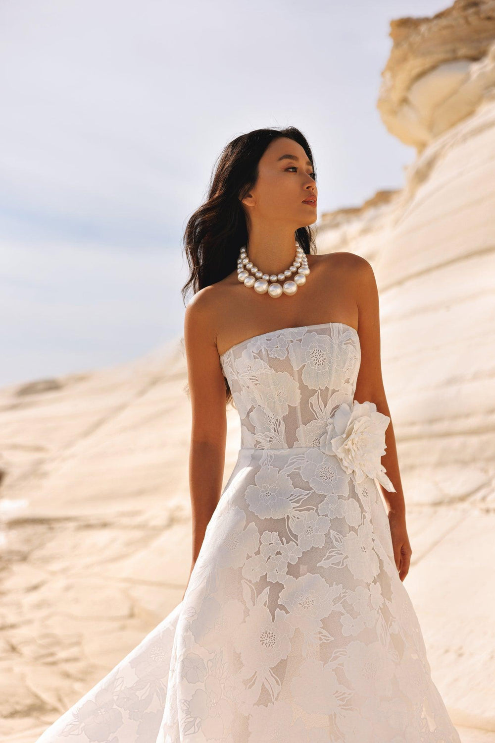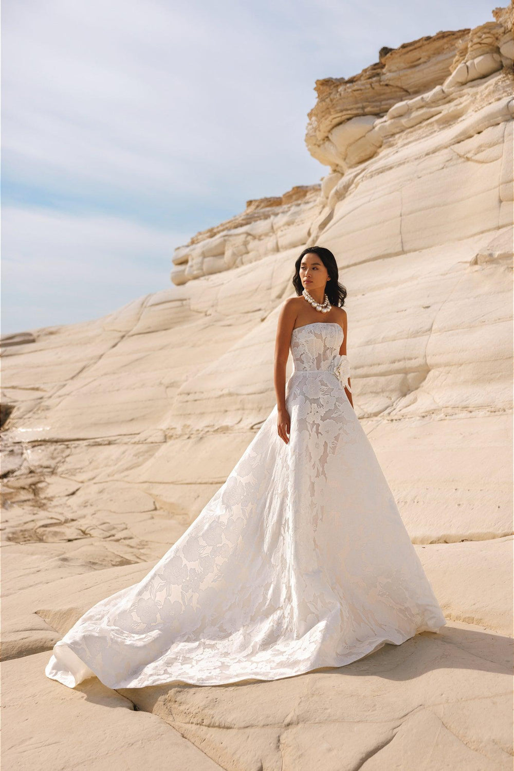 Ein wunderschönes schulterfreies A-Linien-Kleid aus erstaunlichem Jacquard-Organza in Farbe Ivory. Es gibt einen speziell entworfenen Unterrock, der die Form des Kleides hält, es aber dank der durchdachten Konstruktion luftig und leicht hält. Das Kleid mit einem wunderschönen Blumenmuster hat eine große, von Hand gefertigte Blume, die die Taille betont. Der Rock geht sanft in eine lange Schleppe über.