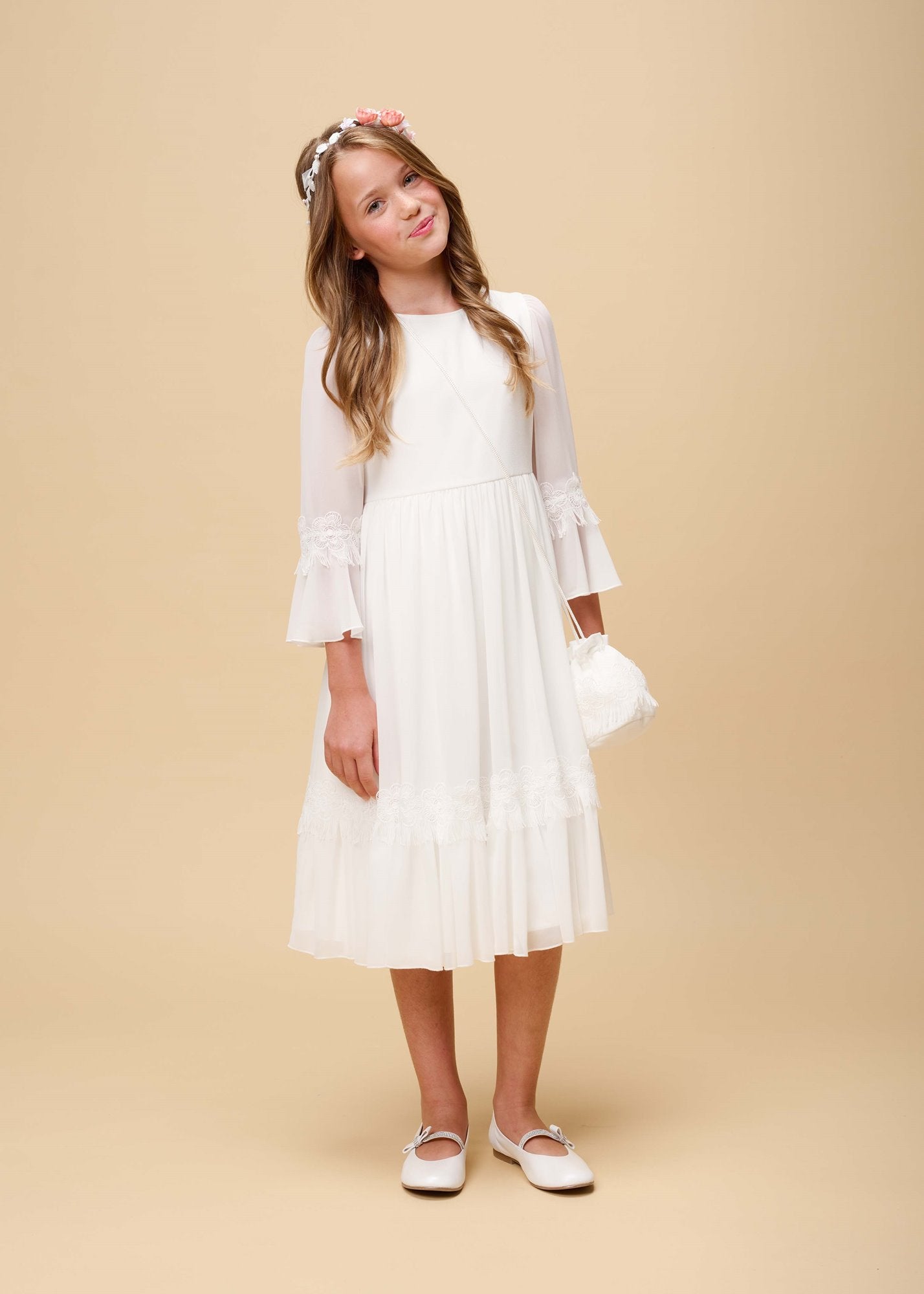 Elegantes Kommunionskleid mit Spitze & Chiffonärmeln – Elfenbeinweiß. Ab Januar 2026 erhältlich